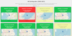 A simple React application to view the location of UK earthquakes with a magnitude of 1.0 and greater each year. It queries USGS web services to gather the data for each earthquake, with each location plotted on a Leaflet map.
