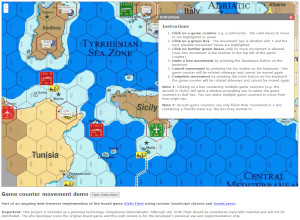 Utilising loosely coupled custom JavaScript classes with a pub-sub system for messaging between components, this demo site shows how game counters can be interactively moved on a hex-based board game map implemented with OpenLayers.